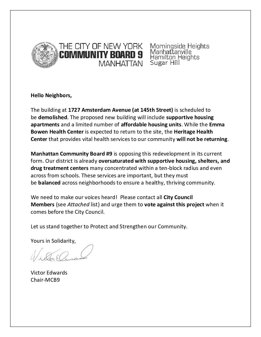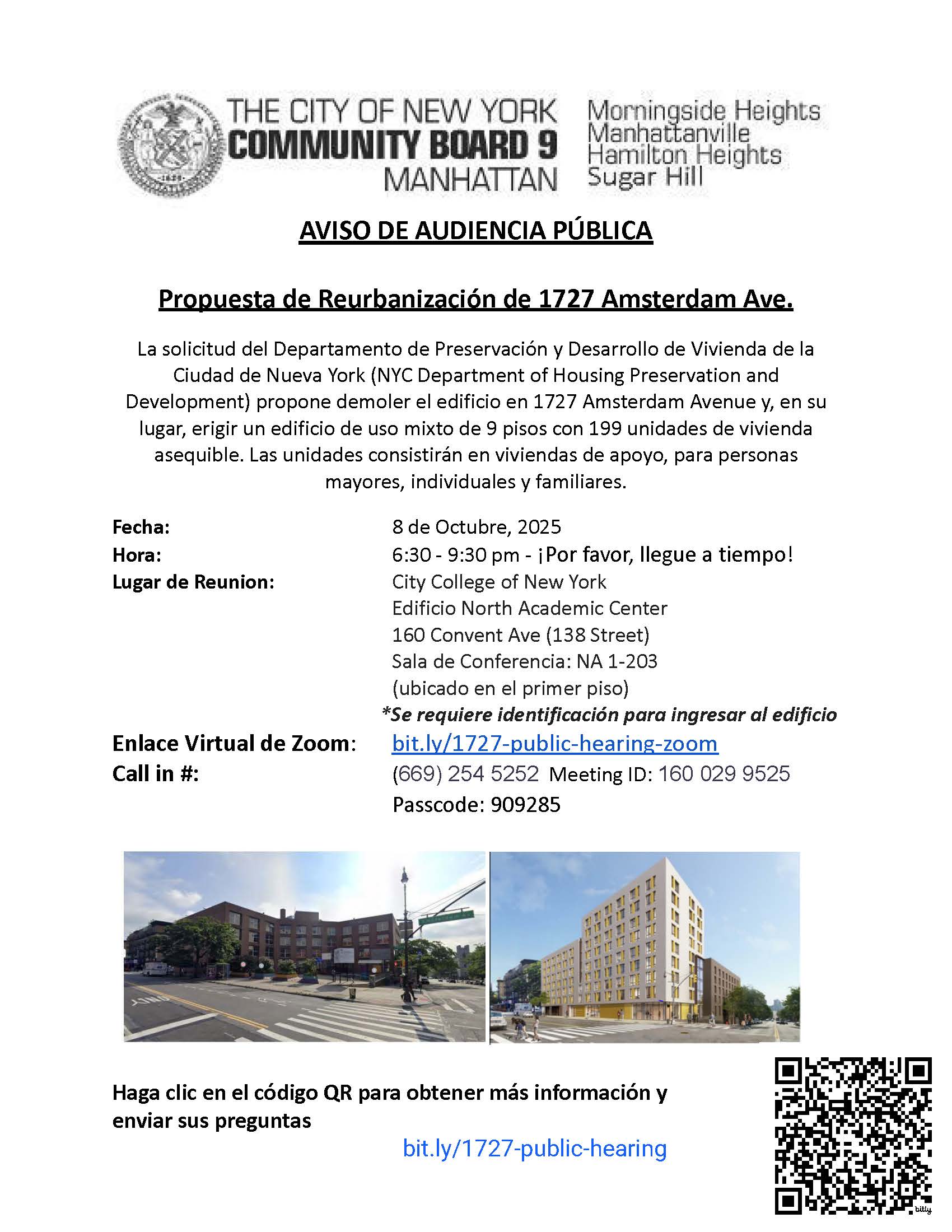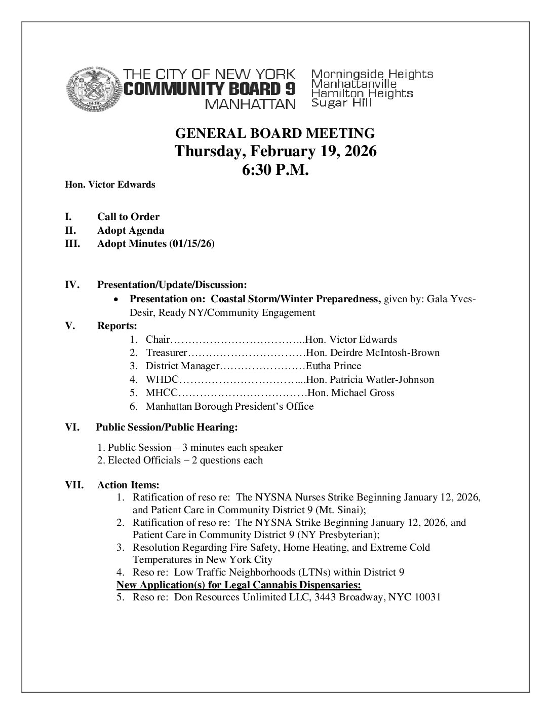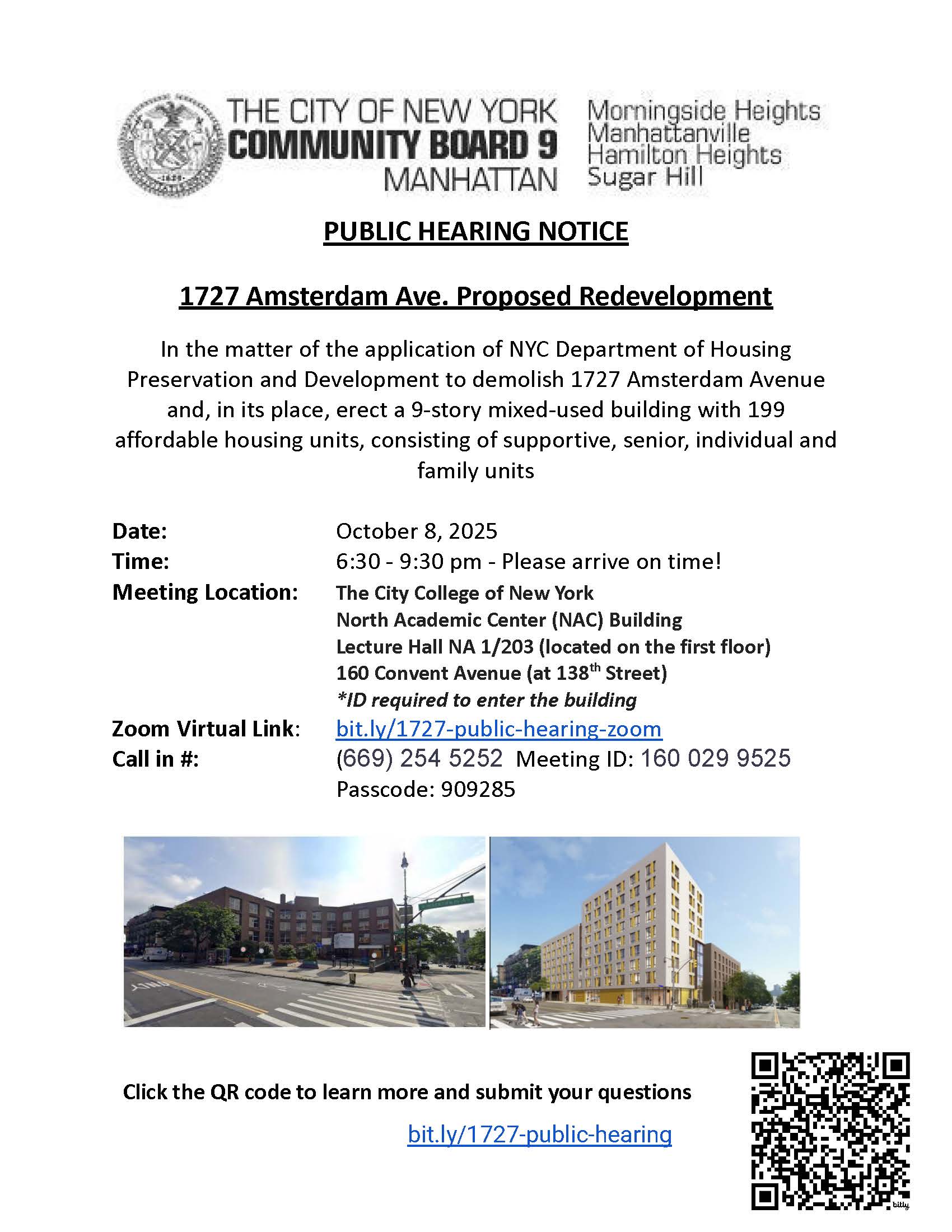 The purpose of Manhattan Community Board 9 (MCB9) is to ensure that City services are accessible and responsive to the needs of all residents, organizations, businesses, and institutions in West Harlem. The New York City Charter mandates that all community boards advise and inform their respective constituencies on matters relevant to their immediate neighborhood. Toward this end, MCB9 convenes 9 committee meetings and Ad-Hoc Committee(s) each month: Arts & Culture; Economic Development; Health & Environment; Landmarks Preservation/Parks; Housing Land Use & Zoning; Uniformed Services, & Transportation; Senior Issues; Strategic Planning(Ad-Hoc); and Youth, Education, & Libraries.
